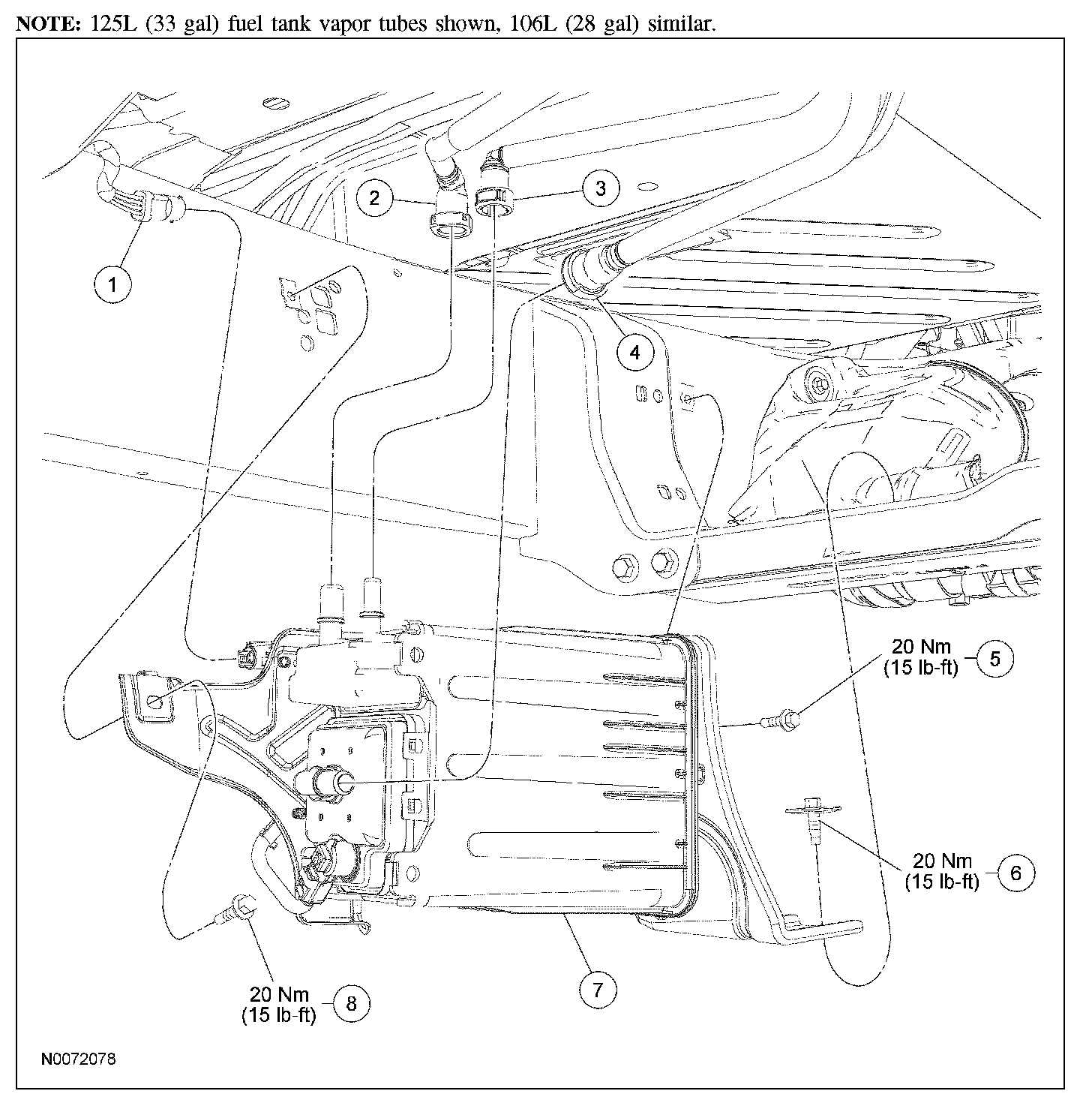 7. Remove the EVAP canister assembly bracket-to-frame rail bolt in the rear.