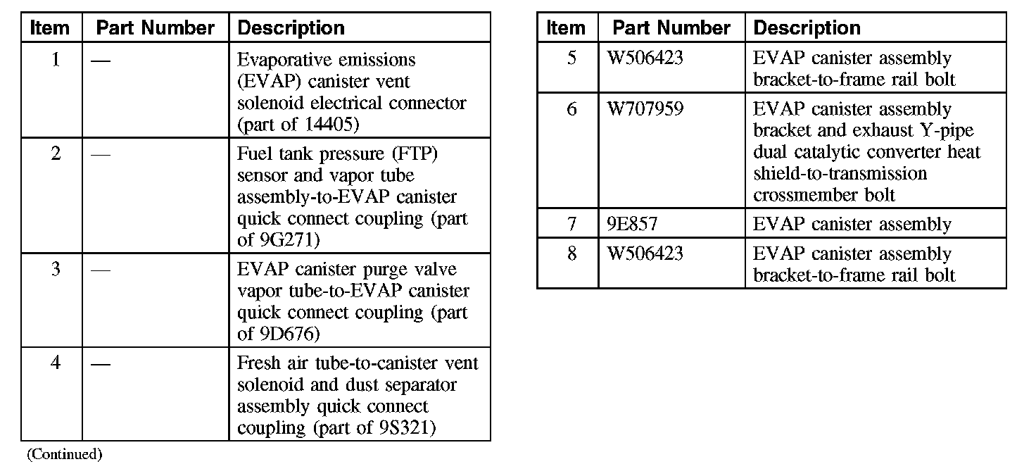 9. Remove the EVAP canister assembly bracket and exhaust Y-pipe dual catalytic converter heat shield-to-transmission crossmember bolt and remove the EVAP canister assembly from the vehicle.