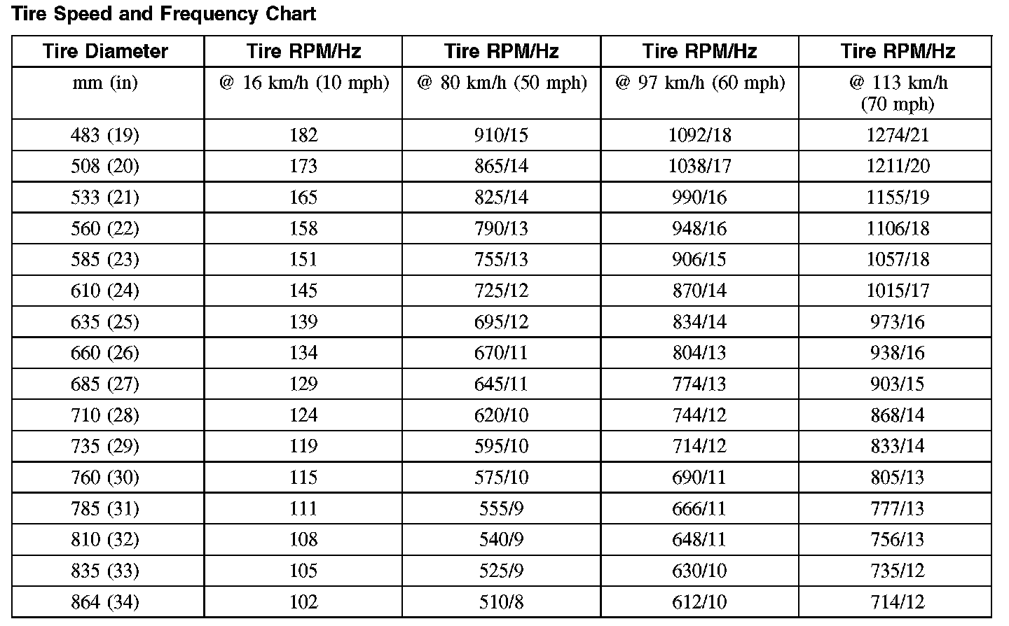 - Obtain the corresponding tire and wheel rpm and frequency from the Tire Speed and Frequency Chart.
