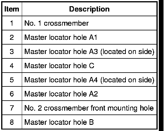 1. Align the No. 1 crossmember on the frame rails. Using the master locator hole in the center of the crossmember for reference.