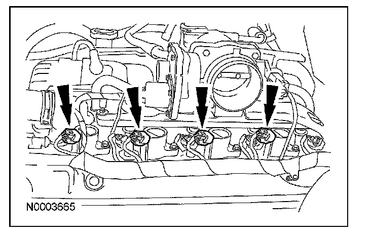 NOTE: Use compressed air to remove any foreign material from the spark plug wells before removing the spark plugs.
