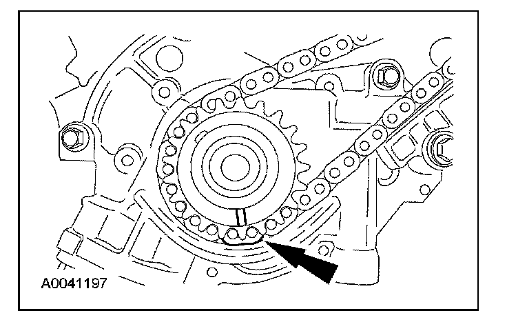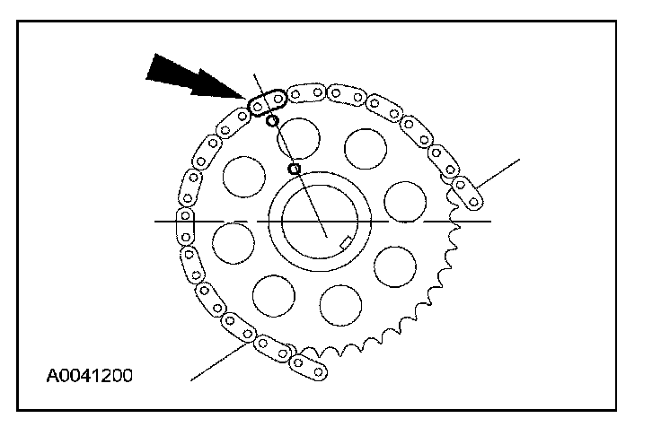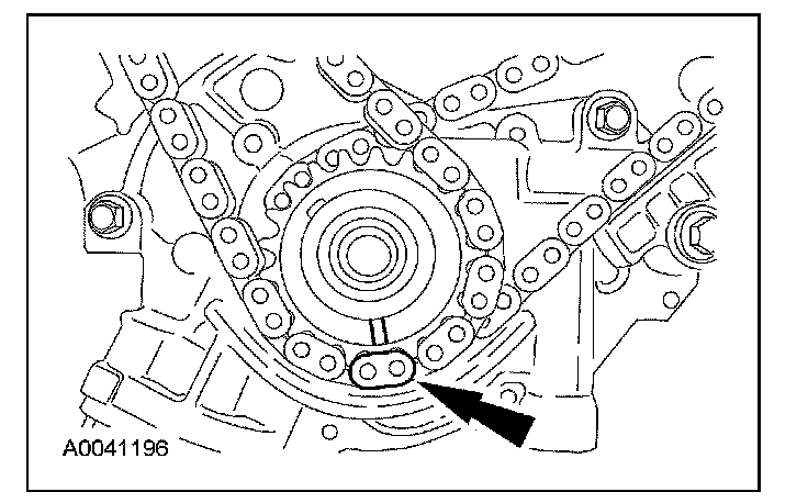 14. Position the LH (inner) timing chain on the crankshaft sprocket, aligning the colored (marked) link with the timing mark on the sprocket.