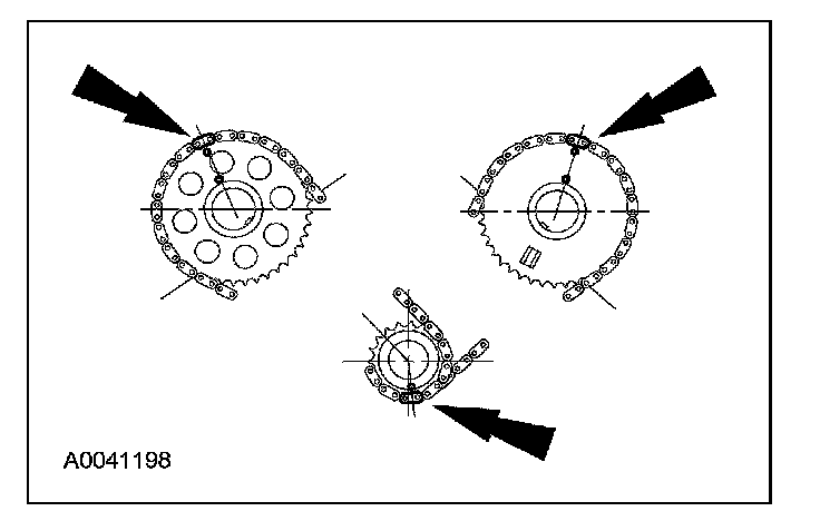 24. Make sure that the colored (marked) chain links are lined up with the dots on the crankshaft sprocket and the camshaft sprockets.