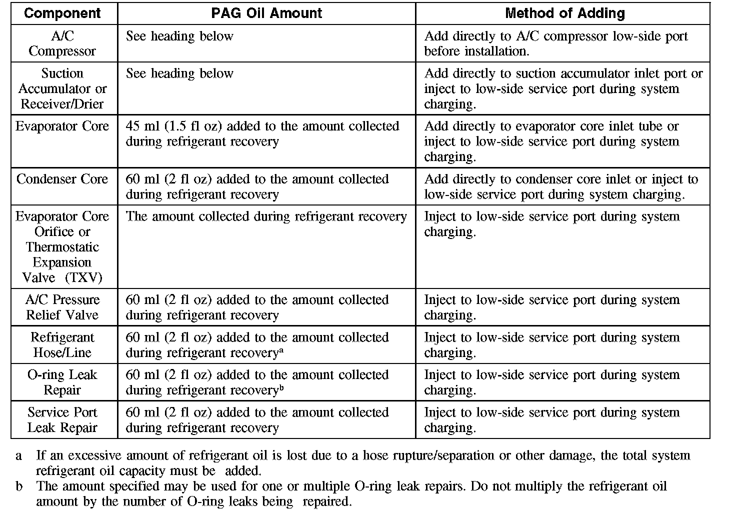 NOTE: This refrigerant oil adding method is to be used when a new suction accumulator or receiver drier only has been installed. If a new A/C compressor and evaporator core orifice or Thermostatic Expansion Valve (TXV) have also been installed due to system contamination, refer to the appropriate heading.