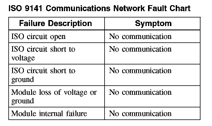 The following fault chart describes the specific ISO 9141 network failures and their resulting symptom: