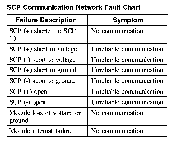 The SCP network uses an unshielded twisted pair cable of data (+) and data (-) circuits. The data (+) circuit is regulated to approximately 0.5 volts and the data (-) circuits to approximately 4.5 volts during neutral or rested network traffic. Voltage on data circuits increases/decreases as bus messages are sent. Multiple bus messages can be sent over the network SCP circuits allowing network modules to communicate with each other. The SCP network operates at a maximum data transfer speed of 41.6 Kbps and remains operational at a degraded level if one of the bus wires becomes open or shorted to ground or voltage.