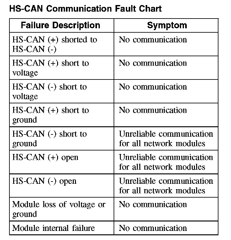 The following fault chart describes the specific HS-CAN failures and their resulting symptom: