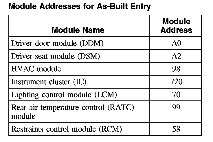 As-Built data is a VIN specific module configuration record. During vehicle build, the configuration from all modules is downloaded and stored in the As-Built database. As Built data will not reflect customer preference items that have been changed from the default state. These items will need to be changed using programmable parameters after the module is configured.