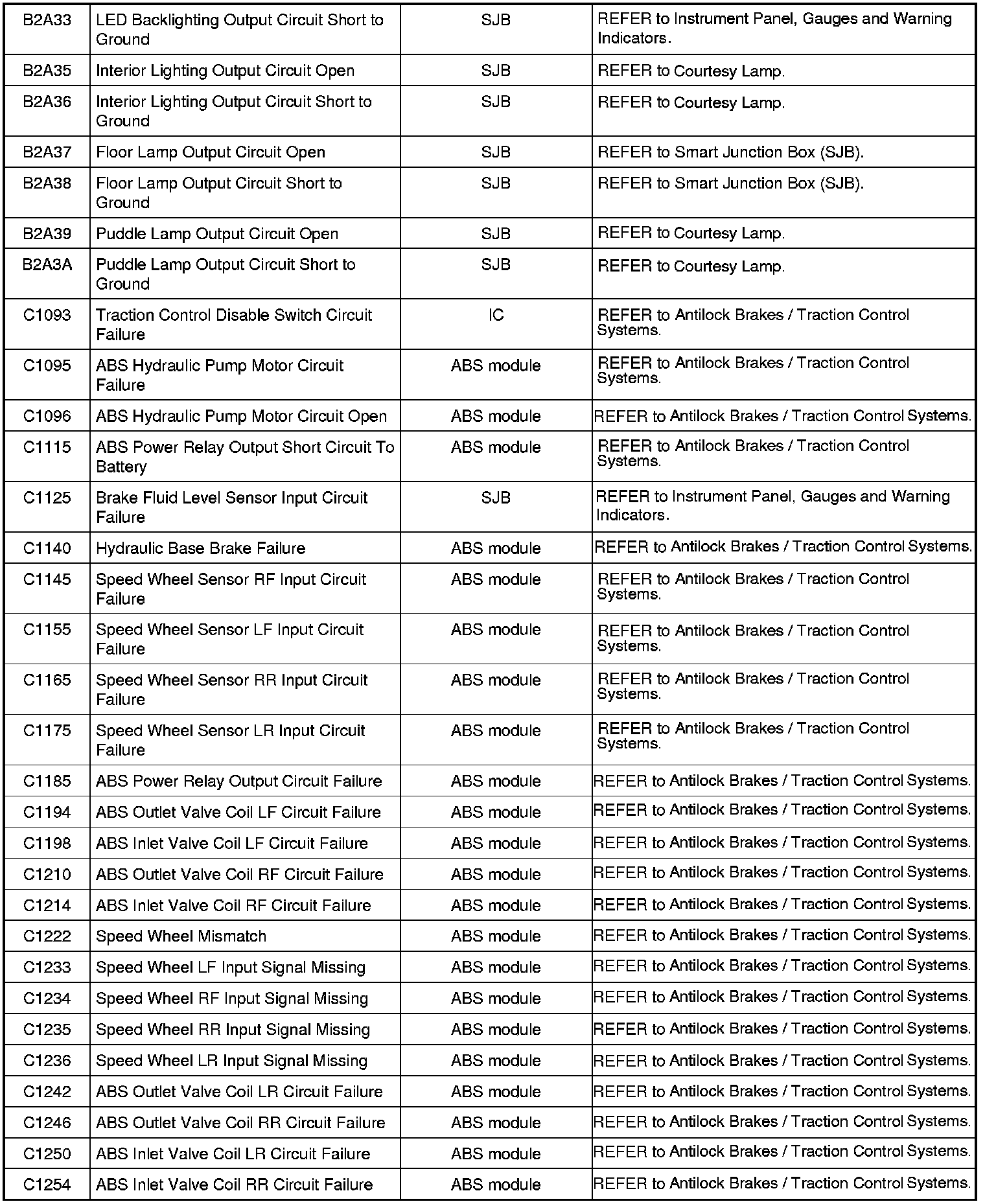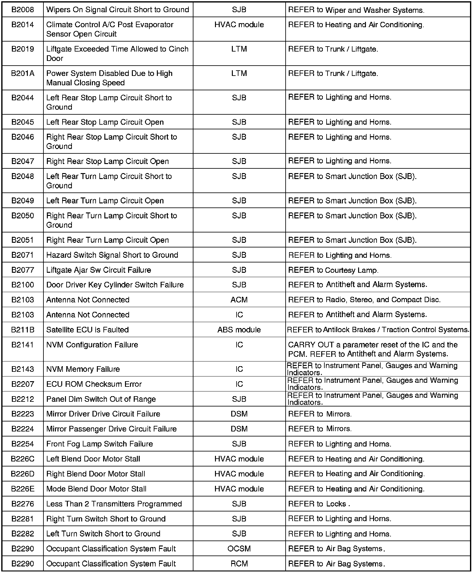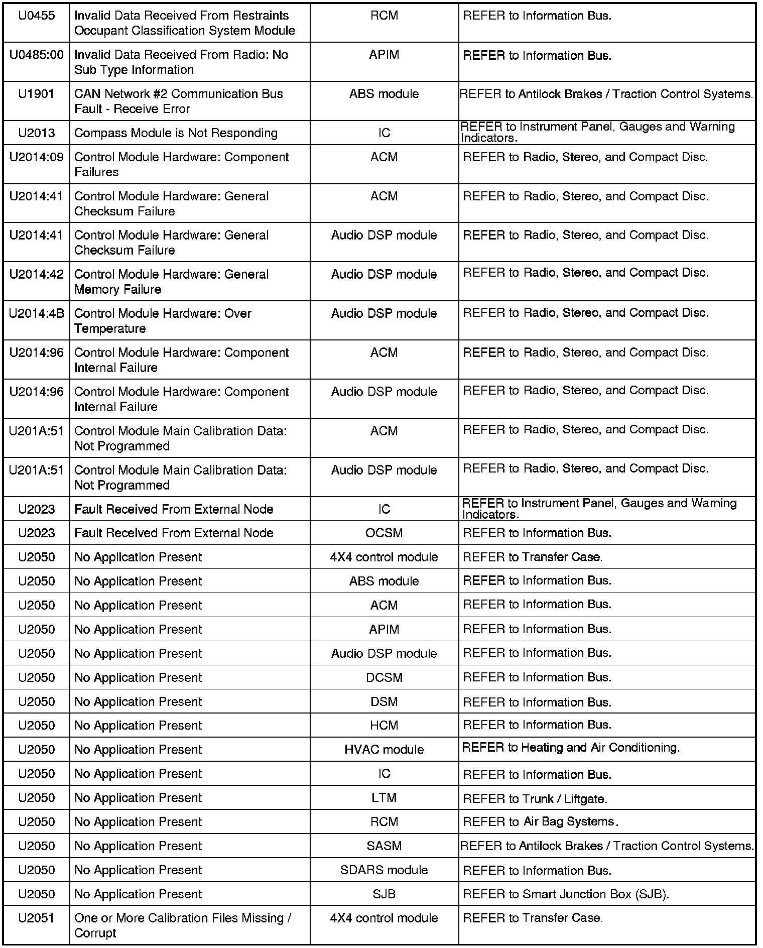 NOTE: Some of these modules utilize a 5-character DTC followed by a 2-character failure-type code. The failure-type code provides information about specific fault conditions such as opens, or shorts to ground. Continuous memory DTCs have an additional 2-character DTC status code suffix to assist in determining DTC history.