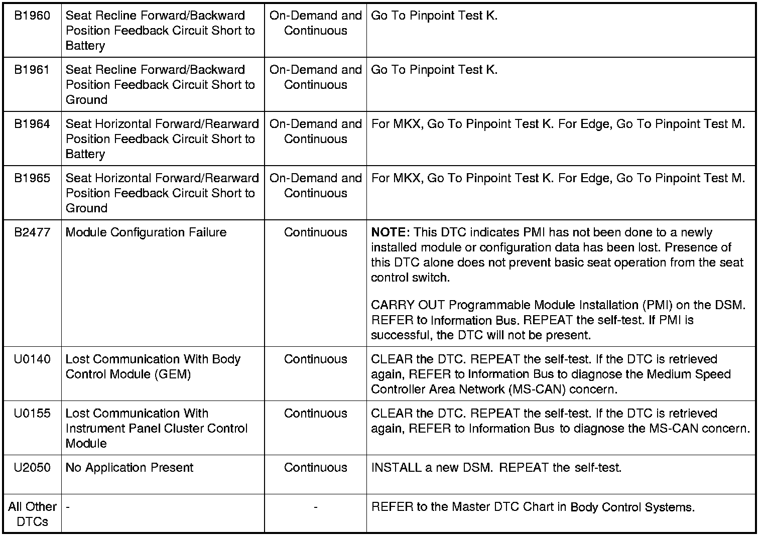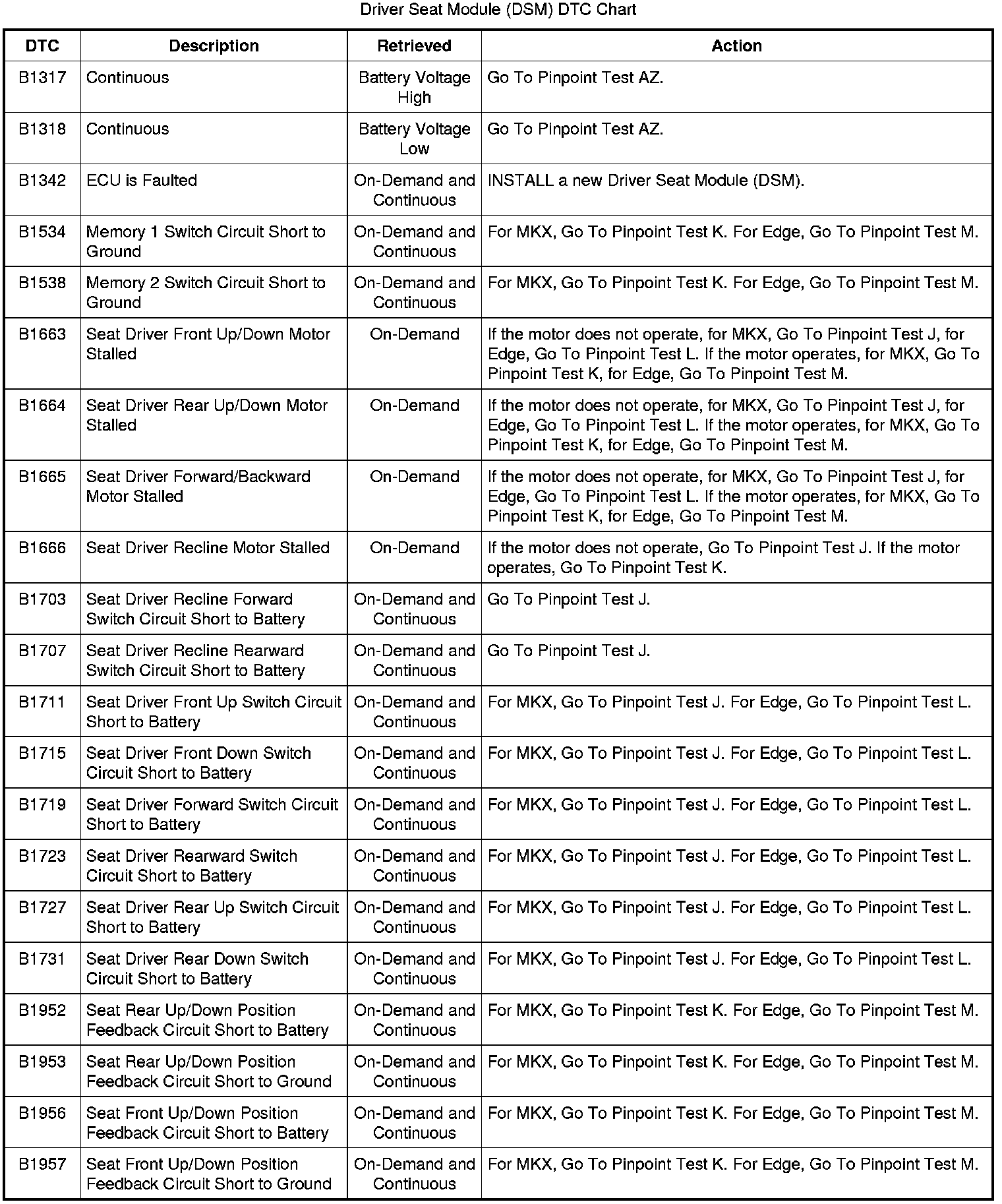 Driver Seat Module (DSM) DTC Chart