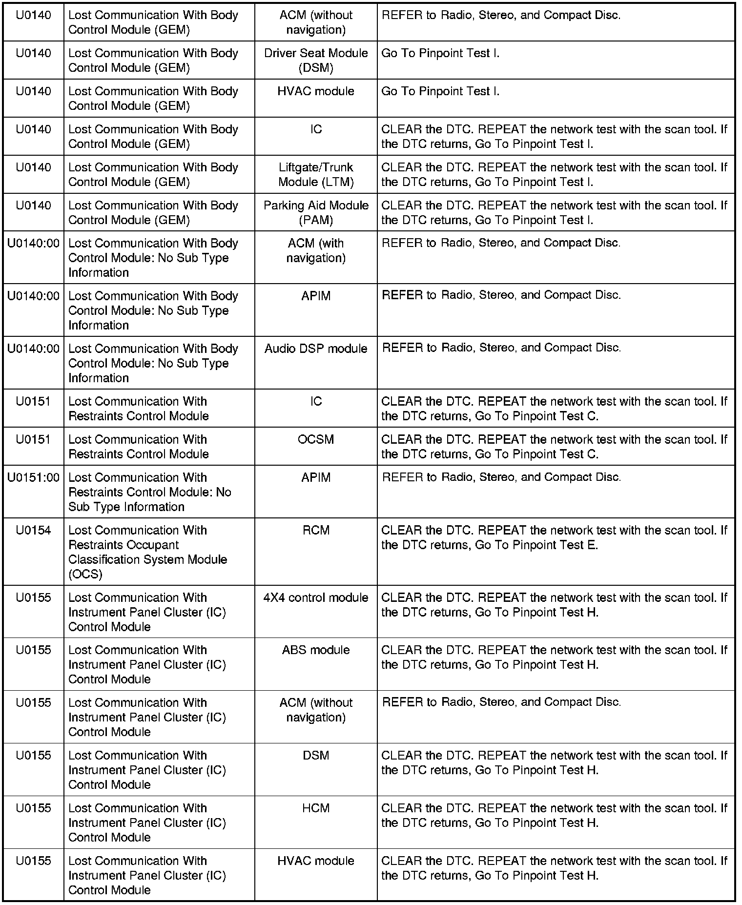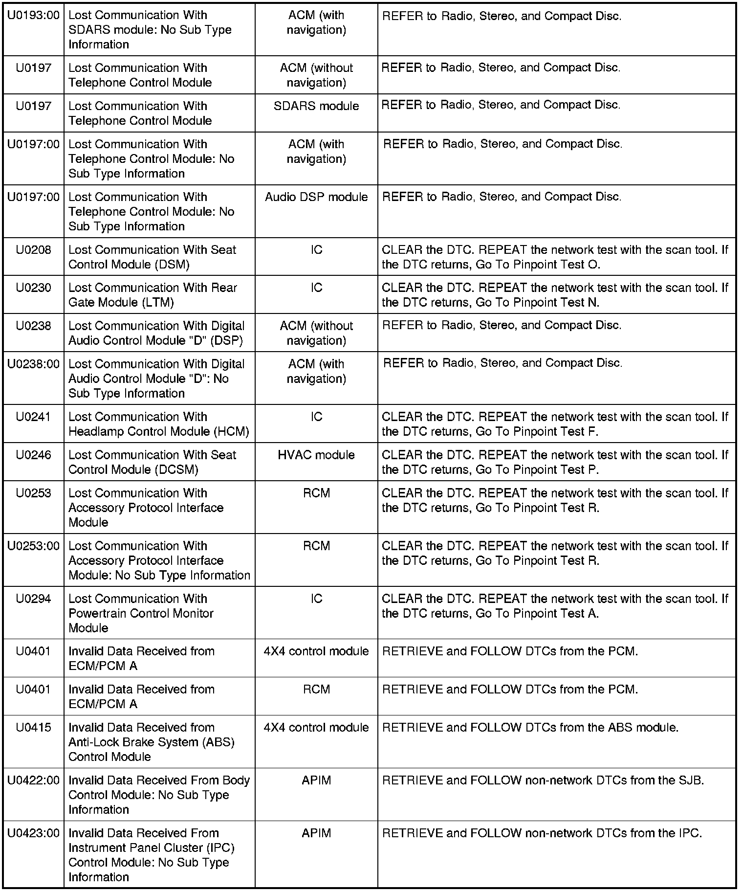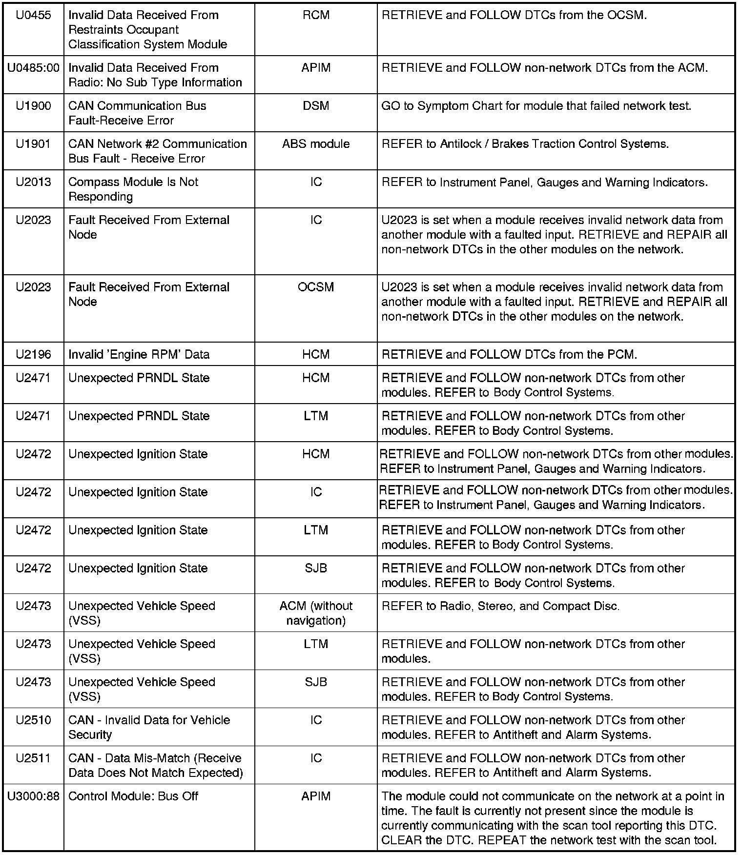 NOTE: Network DTCs (U-codes) are often a result of intermittent concerns such as faulty wiring or low battery voltage occurrences. Additionally, vehicle service procedures such as module reprogramming will often set network DTCs. Replacing a module to resolve a network DTC is unlikely to resolve the concern. To prevent repeat network DTC concerns, inspect all network wiring, especially connectors. Test the vehicle battery, refer to Battery.