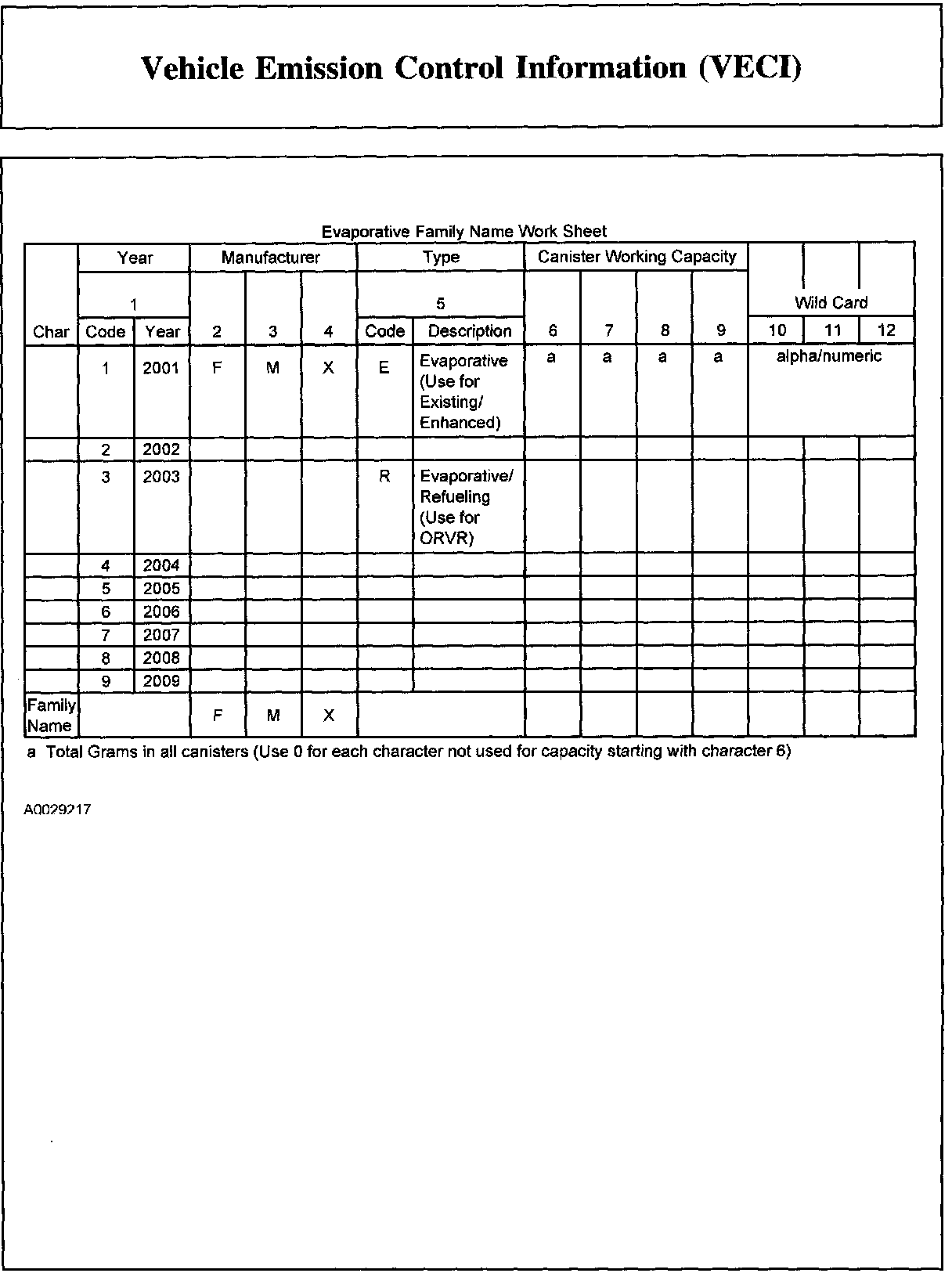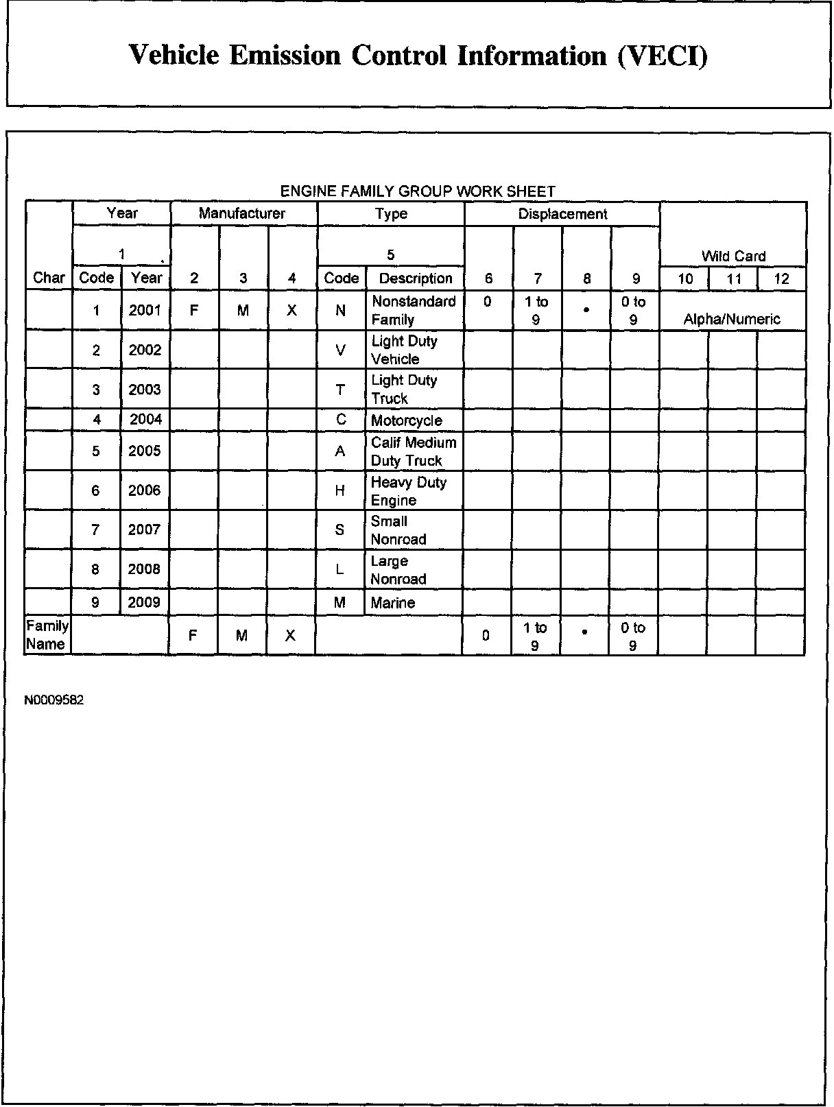 Both the engine family group and the evaporative family name are listed in the box on the emission decal as indicated in the area marked as engine evaporative family information. The first line contains engine size and the 12-character engine family group. The second line contains the 12-character evaporative family name information. Both the engine family group and the evaporative family name are specific to the vehicle. Please refer to the Engine Family Group and the Evaporative Family Name worksheet for decoding information.