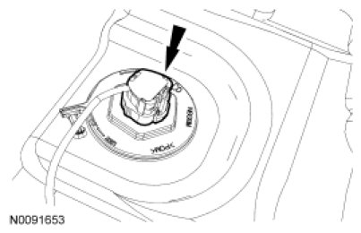 8. Release the lock tab, rotate the fuel level sensor counterclockwise approximately one-fourth turn, lift and position aside.
