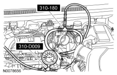 9. NOTE: Carry out a Key ON Engine OFF (KOEO) visual inspection for fuel leaks prior to the Fuel System Pressure Test.