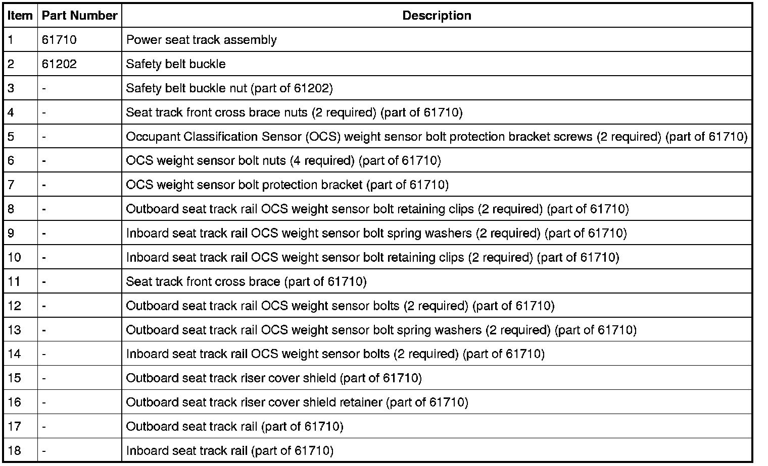 WARNING: Use care when handling the front passenger seat and track assembly. Dropping the assembly, placing excessive weight on or sitting on a front passenger seat that is not secured in the vehicle may result in damaged seat components. Failure to follow these instructions may result in incorrect operation of the occupant classification sensor (OCS) system and increases the risk of serious personal injury or death in a crash.