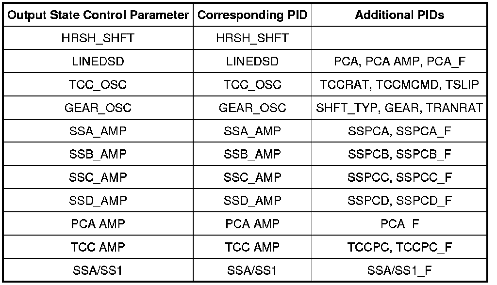To confirm that the output state control value was sent by the scan tool and the PCM has accepted the output state control command, a corresponding PID for each output state control parameter must be monitored. After sending the output state control value, the corresponding PID value should be the same as the output state control value that was sent. Additional PIDs are listed that may be monitored to help the technician accurately diagnose the transaxle.