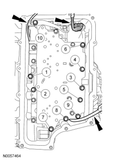 Position the TSS, OSS and TR sensor wiring harnesses aside and install the main control valve body, the TR sensor detent spring and the 10 bolts. Tighten the bolts in the sequence shown.