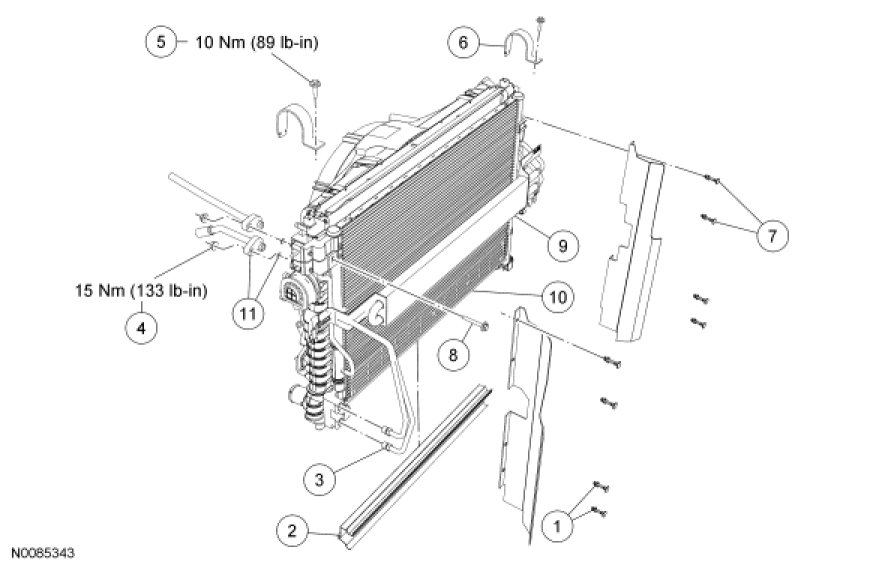 6. Disconnect the 2 transmission cooler line fittings at the condenser.