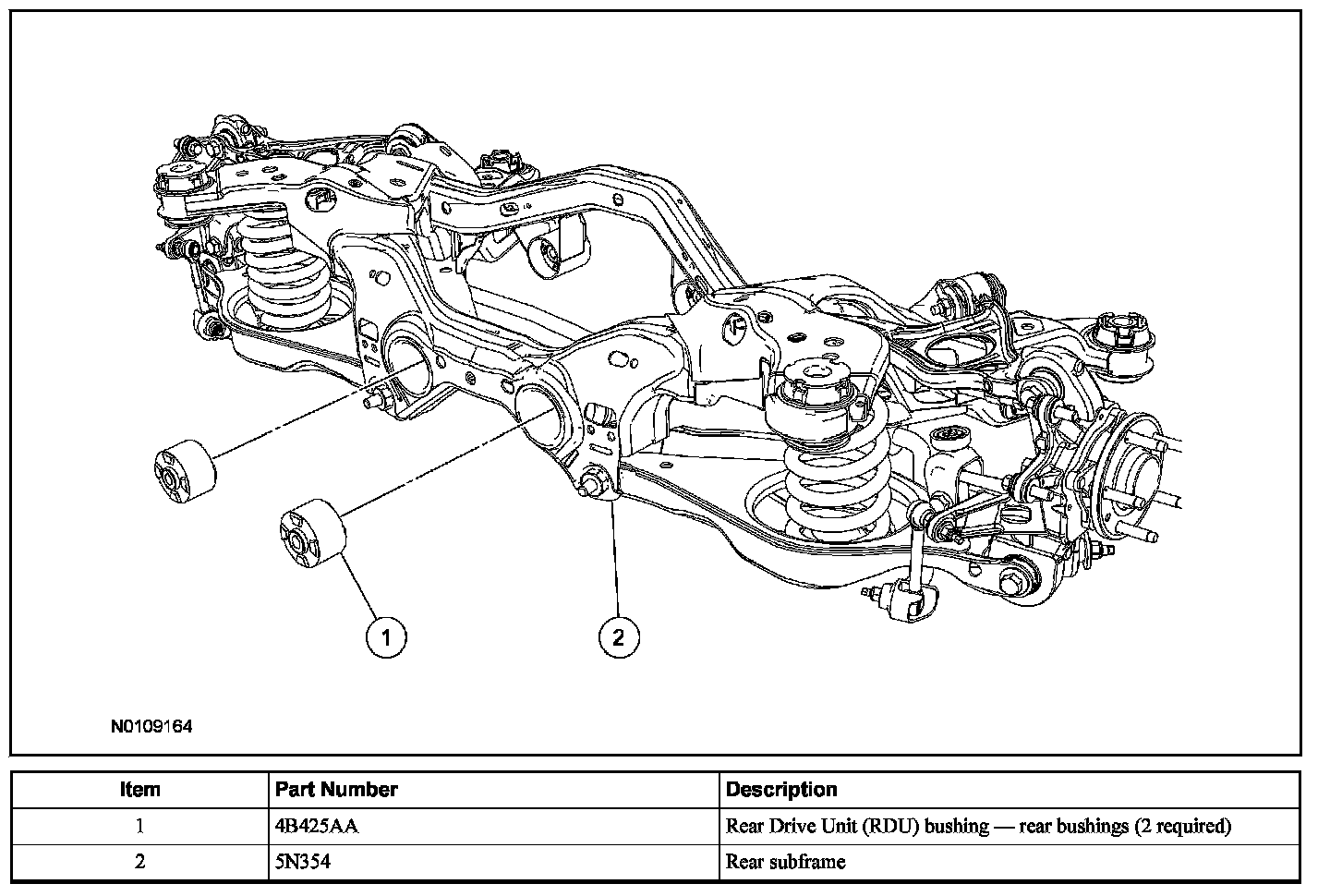 - When installing the RDU bushing, Rear Drive Unit (RDU) Bushing (70 mm) Remover/Installer 204-616/2 will fall away as the RDU bushing is installed into the subframe. The Rear Drive Unit (RDU) Bushing (70 mm) Remover/Installer does not control the depth of the bushing. The RDU bushing is fully seated when the Rear Drive Unit (RDU) Bushing (70 mm) Remover/Installer 204-616/3 and Rear Drive Unit (RDU) Bushing (70 mm) Remover/Installer 204-616/1 fall away from the subframe, do not continue to tighten the Rear Drive Unit (RDU) Bushing (70 mm) Remover/Installer.
