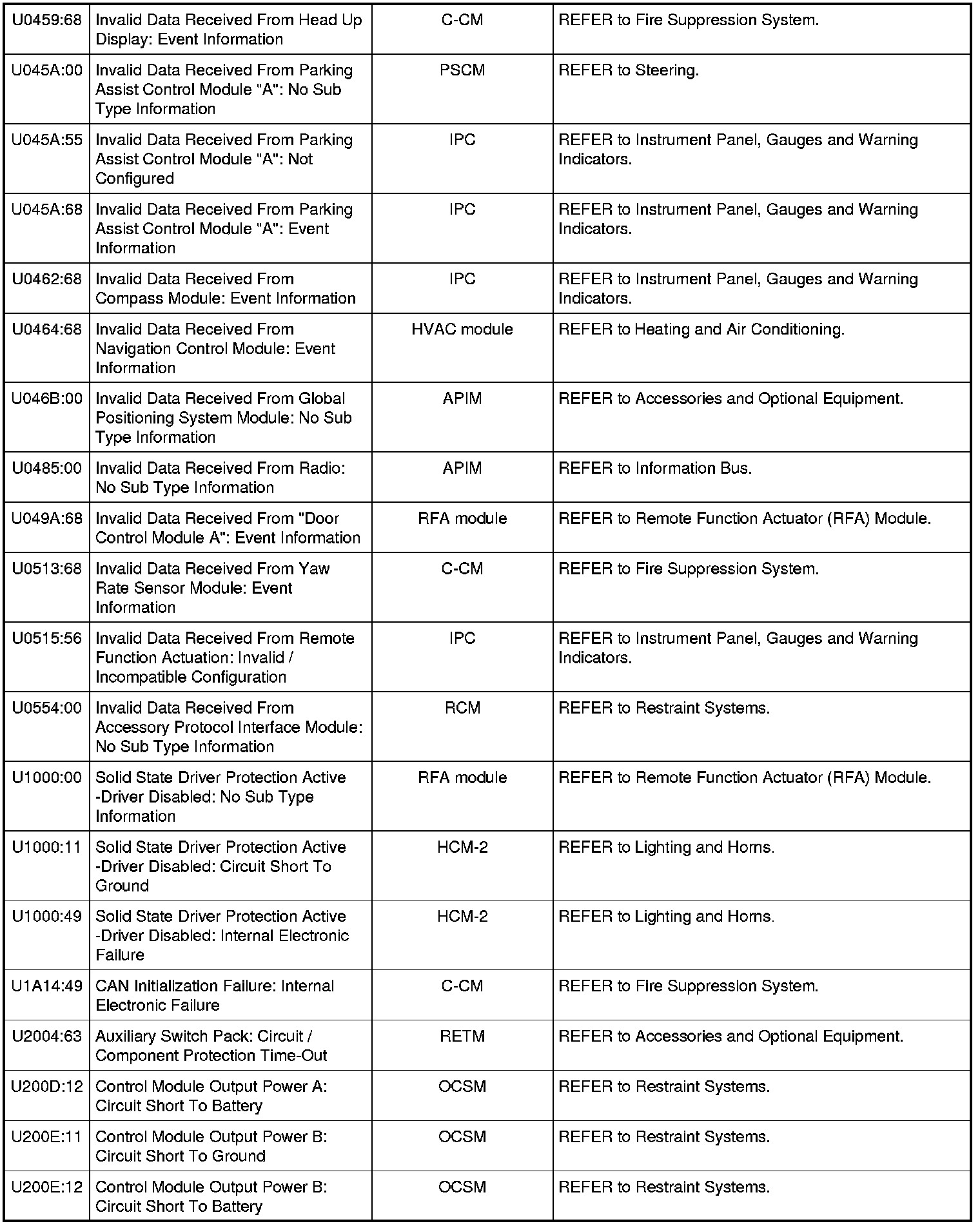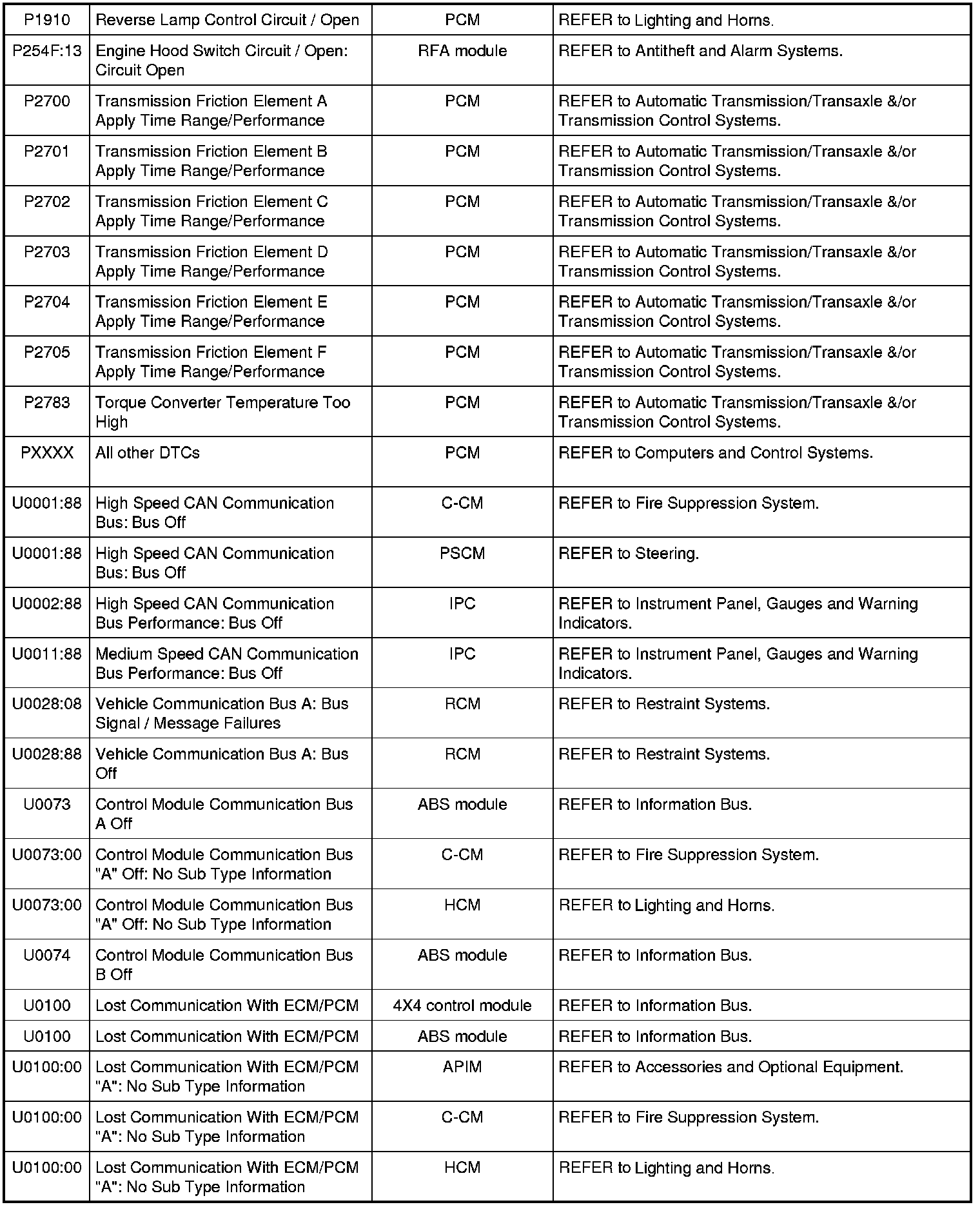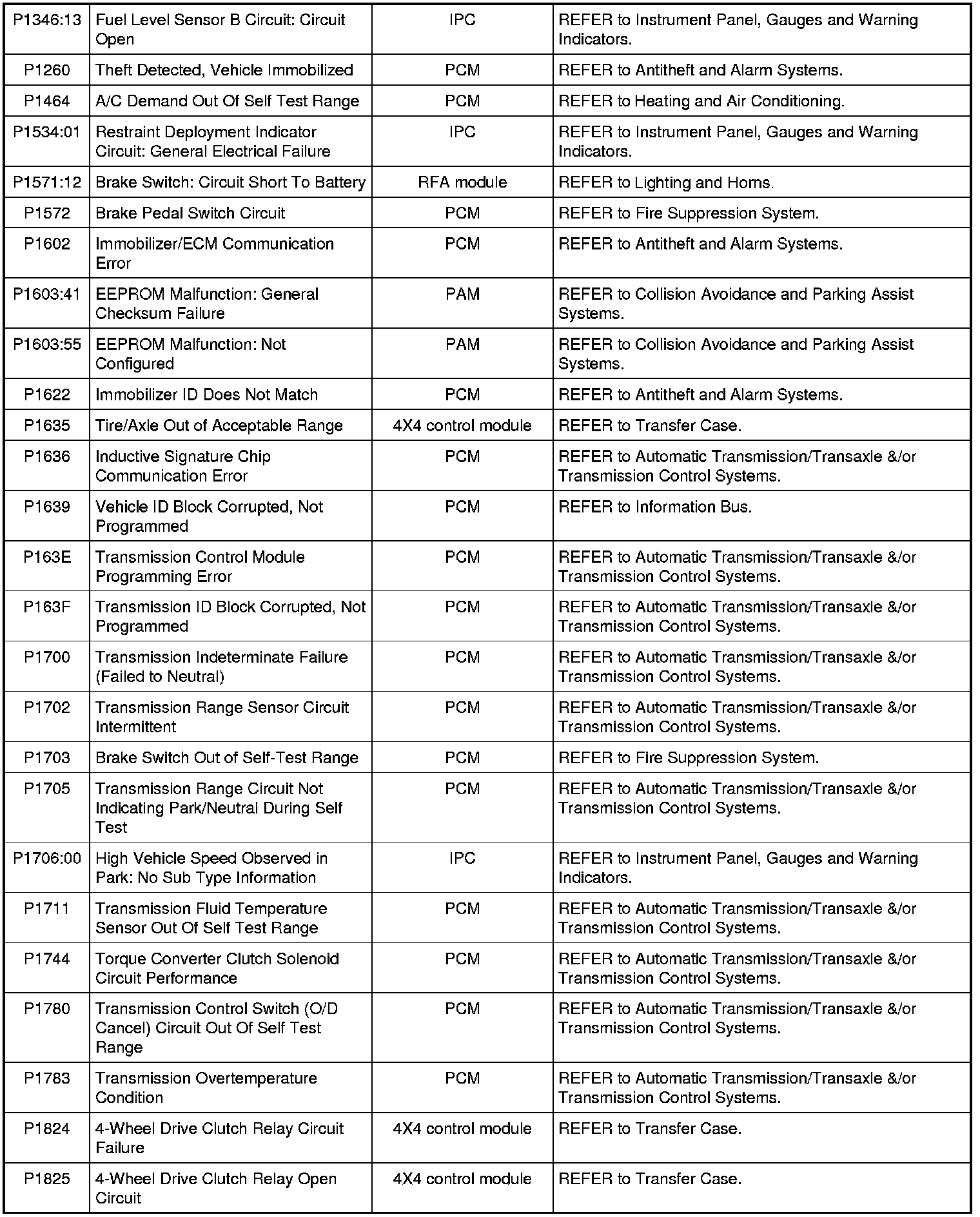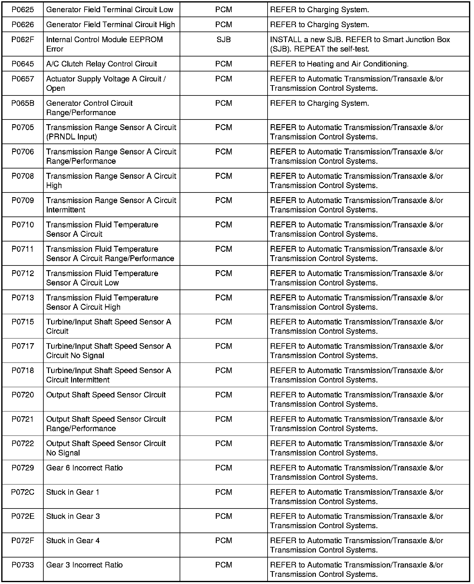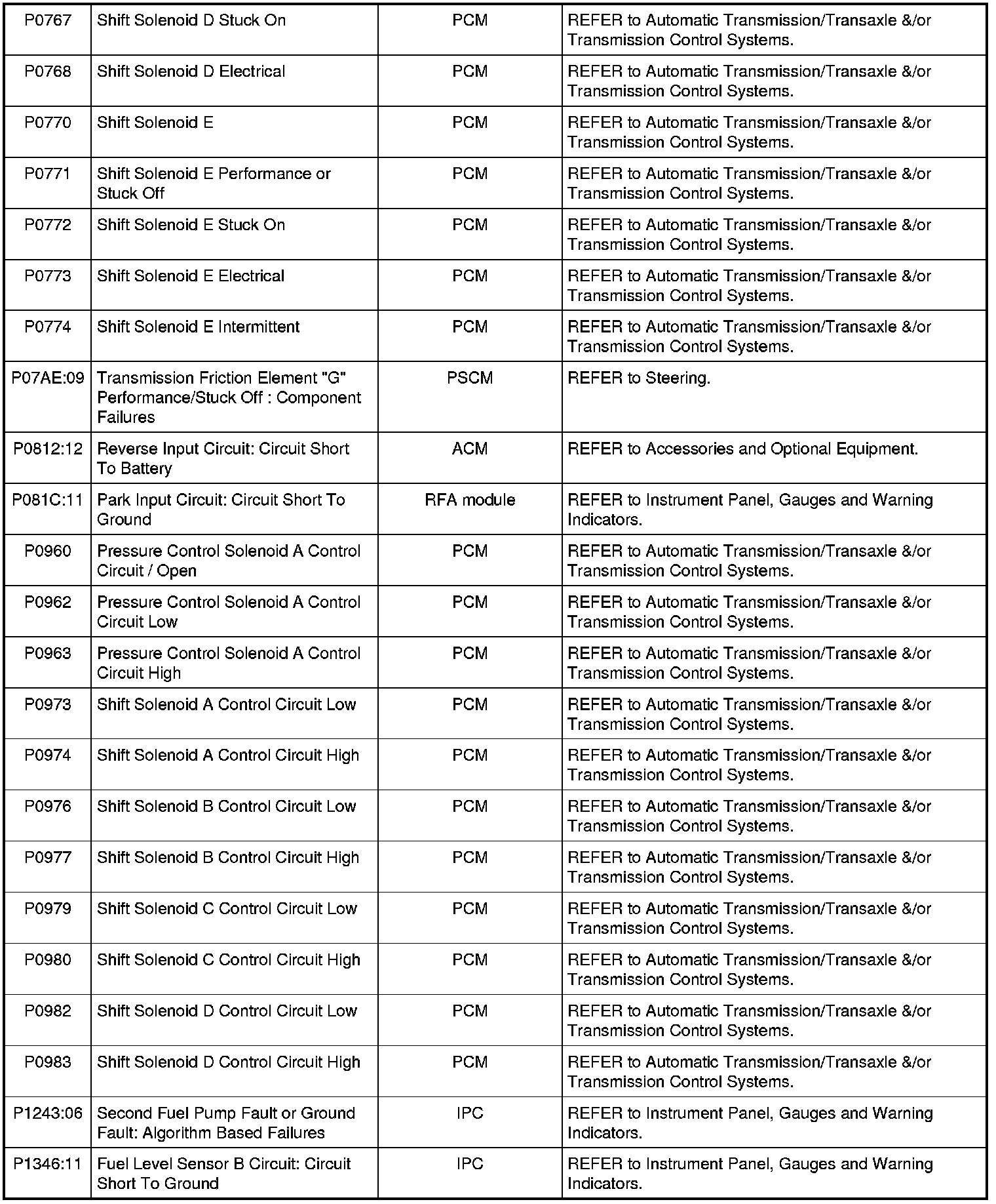NOTE: Most powertrain (P-code) DTCs are diagnosed in Computers and Control Systems Information. If the P-code retrieved is not listed below, refer to Computers and Control Systems Information to continue diagnostics.