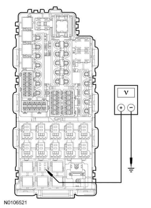 - Measure the voltage between refrigerator relay socket pin 5, circuit SBP02 (YE/RD) and ground.