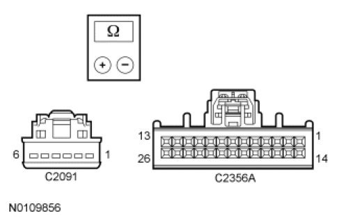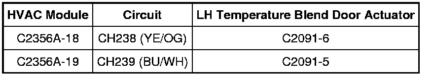 - For DTC B1081:00, measure the resistance between HVAC module C2356A, harness side and LH temperature blend door actuator C2091, harness side using the following chart: