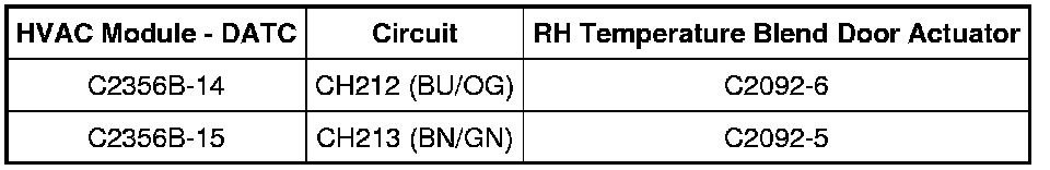 - For DTC B1082:00, measure the resistance between HVAC module - DATC C2356B, harness side and RH temperature blend door actuator C2092, harness side using the following chart: