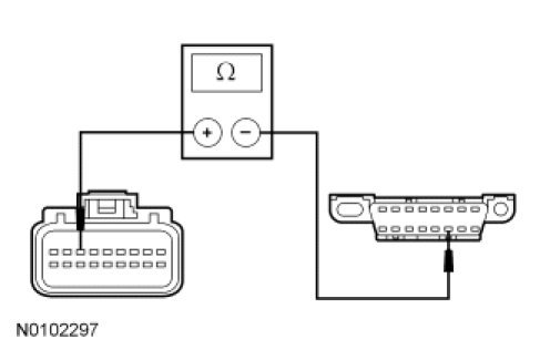 - Measure the resistance between the C-CM C1582-8, circuit VDB04 (WH/BU), harness side and the DLC C251-6, circuit VDB04 (WH/BU), harness side.
