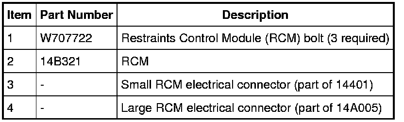 1. WARNING: Always tighten the fasteners of the restraints control module (RCM) and impact sensor (if equipped) to the specified torque. Failure to do so may result in incorrect restraint system operation, which increases the risk of personal injury or death in a crash.