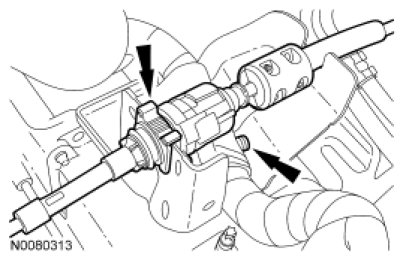 19. Remove the Electronic Power Assist Steering (EPAS) harness bracket bolt, then disconnect the 2 EPAS electrical connectors (1 shown) and the wiring retainer (not shown).