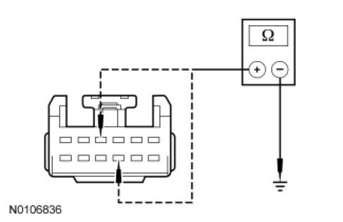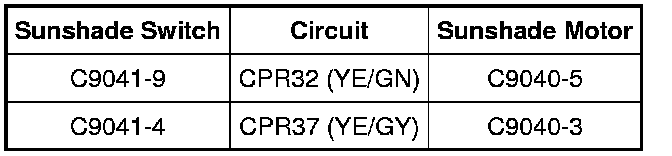 - Measure the resistance between sunshade switch C9041-4, circuit CPR37 (YE/GY), harness side and ground; and between sunshade switch C9041-9, circuit CPR32 (YE/GN), harness side and ground.