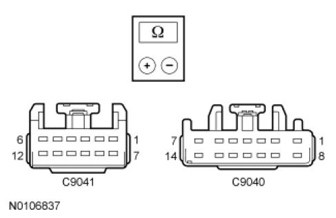 - Measure the resistance between sunshade switch C9041, harness side and sunshade motor C9040, harness side using the following table:
