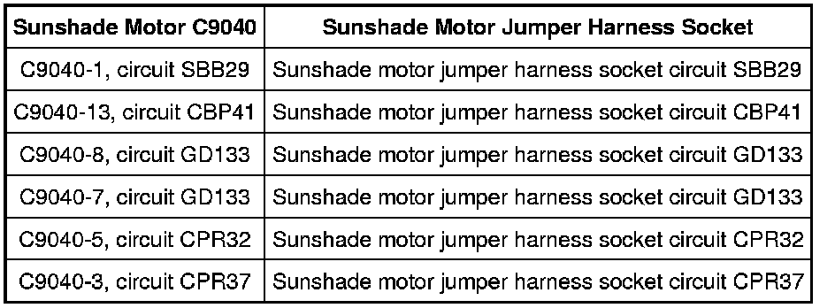 - Using the following table, check the sunshade motor jumper harness for loose pins, an open or a short between sunshade motor C9040, component side and the sunshade motor jumper harness socket: