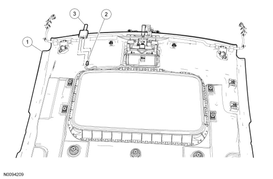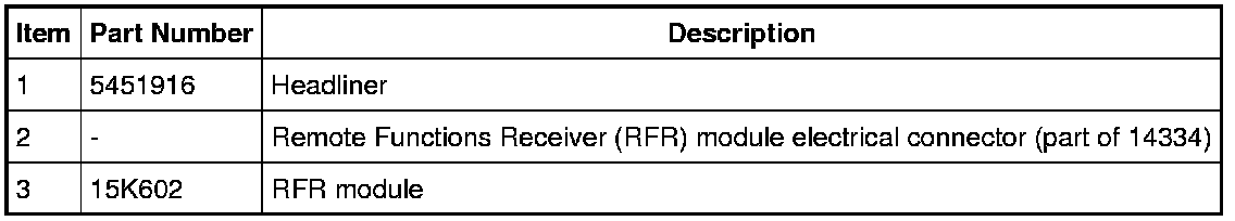 4. NOTE: The RFR module is secured to the headliner with 3M Duramix(R) 4747 Super Fast Adhesive at the assembly plant. When installing the RFR module, make sure to use 3M Duramix(R) 4747 Super Fast Adhesive to secure the RFR module to the headliner in approximately the same position and orientation on the headliner.