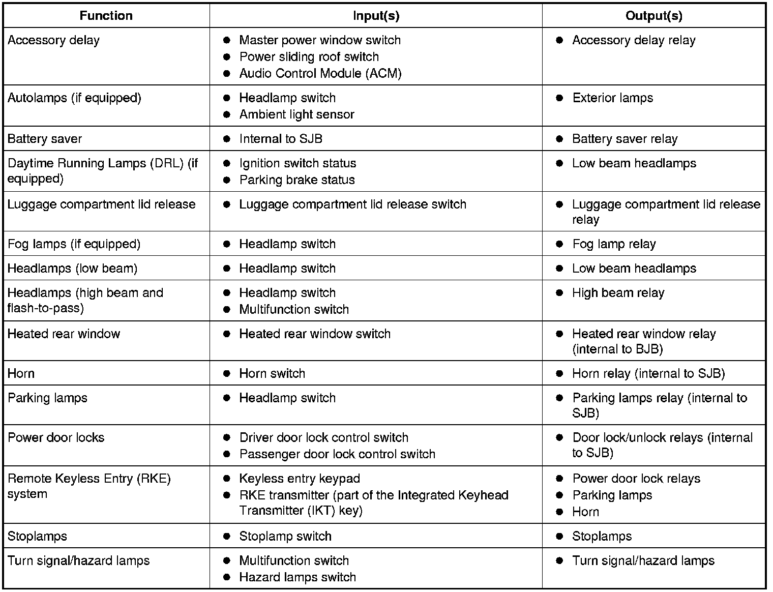 The SJB is a multifunction electronic module that controls many of the vehicle systems. Most of the SJB functions utilize hardwired inputs and/or outputs. The SJB controls the following hardwired functions, using the corresponding inputs and outputs: