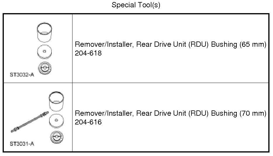 2. NOTE: The Rear Drive Unit (RDU) Bushing (65 mm) Remover/Installer 204-618/1 must be used to remove the bushing to make sure that it passes through the receiver cup.