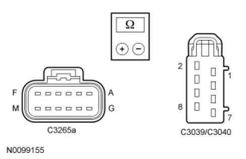 - Measure the resistance between DCSM C3265A, harness side and cushion TED C3040, harness side; and between DCSM C3265A, harness side and backrest TED C3039, harness side using the following chart: