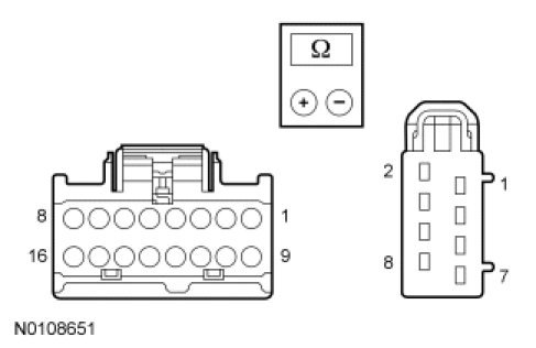 - Measure the resistance between DCSM C3265B-7, circuit VHS26 (VT), harness side and DCSM C3265B-8, circuit RHS05 (YE/VT), harness side.
