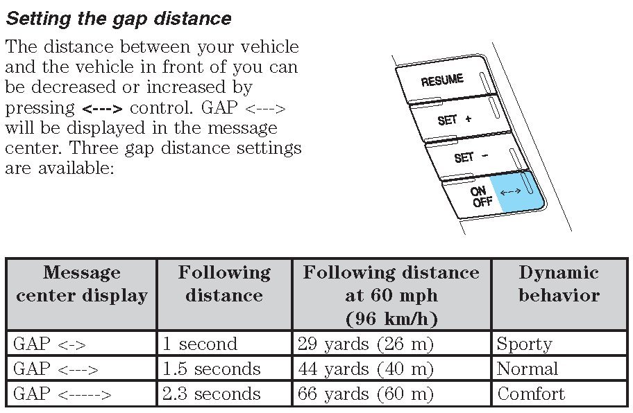 After each ignition cycle, the previous gap setting is remembered and the system is set to that GAP setting. The message center momentarily displays the preset gap each time the distance gap is set.