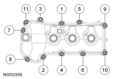 NOTICE: Early build engines have 11 fastener valve covers, late build engines have 9 fastener valve covers. Do not attempt to install bolts in the 2 empty late build valve cover holes or damage to the valve cover will occur.