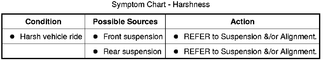 Harshness is customer perception which gives the impression of no isolation from the tire/wheel and suspension system. Harshness may be caused by road conditions, temperature changes, component damage and/or incorrect customer modifications on original components/specifications. Customers usually experience harshness when the vehicle is driving over bumps or potholes and in cold weather conditions. Harshness can also be experienced with excessive tire pressure, sporty tires, heavy-duty springs and shocks, or other vehicle modifications. Some aftermarket tires, even with the correct size, may change vehicle behavior and produce customer concerns. The first step in diagnosing a harshness concern is to determine if the concern was experienced only in certain specific operating conditions, such as large potholes or extremely cold weather. In these cases, harshness should be considered normal. A known good vehicle can be driven under the same conditions and the rides can be compared to determine whether the concern is normal or vehicle specific. The second step is to check tire pressure and make sure it was set within vehicle specifications. The third step is to inspect for aftermarket or modified components and determine if they are the cause of the harshness complaint. If the harshness concern persists after the above steps, it is possible that some components are damaged. Based on the results from the road test, make a determination of which action in the symptom chart to take first.