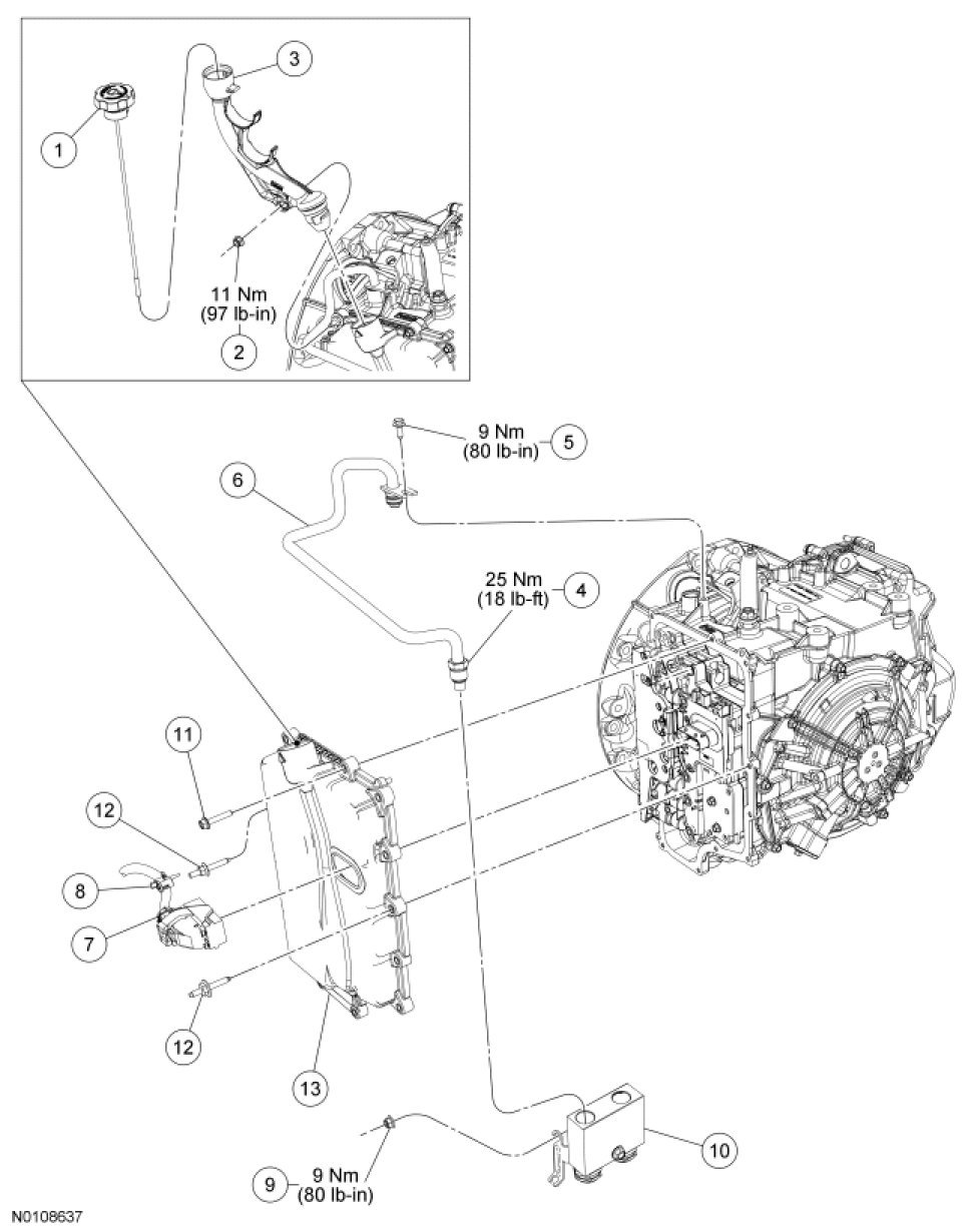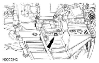 9. Remove and discard the transmission fluid cooler tube bolt and remove the transmission fluid cooler tube.
