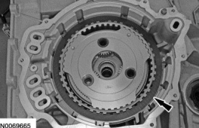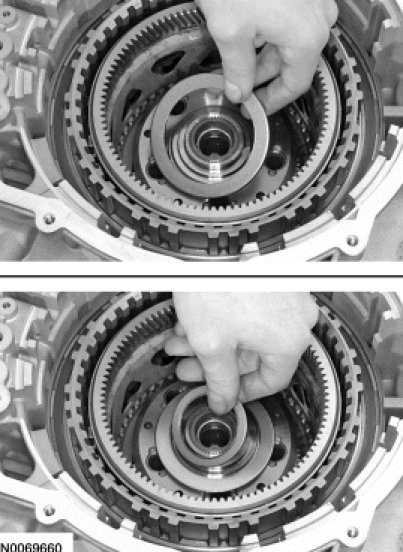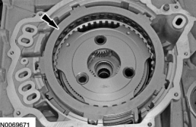 88. NOTICE: Failure to align the tab on the bottom of the low/reverse pressure plate with the gap in the low One-Way Clutch (OWC) snap ring may result in damage to the transaxle.