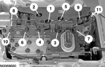 114. Tighten the solenoid body bolts in the sequence shown.