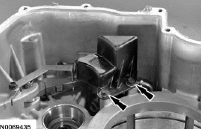 67. Remove the bolt and the fluid baffle from the torque converter housing.