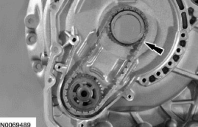 45. NOTICE: Carefully pry on the transaxle torque converter housing and the case to separate the torque converter housing from the case. Do not pry up on the silicone sealant mating surfaces, damage to the mating surfaces may occur. Carefully lift the torque converter housing off the dowel pins.