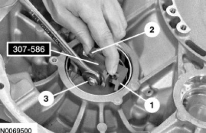1. Position the Differential Bearing Cup Remover 307-586 in the transaxle case with the tabs on the Differential Bearing Cup Remover 307-586 aligned with the slots in the transaxle case.