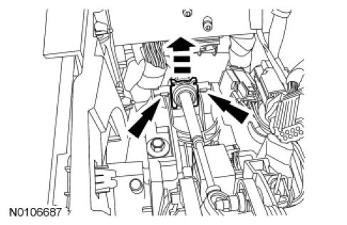 14. Depress the 2 tabs, remove the selector lever cable from the bracket and remove the selector lever cable through the inside of the vehicle.