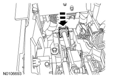 Route the selector lever cable from under the HVAC unit. Pull the selector lever cable through the HVAC vent tunnel until the end is behind the LH front floor vent and position the selector lever cable aside.