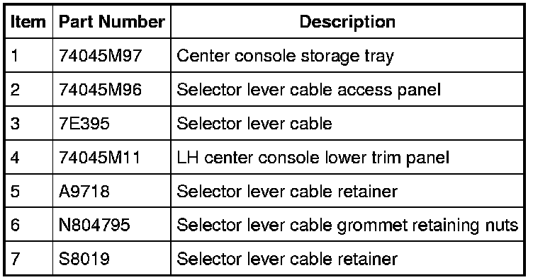8. Disconnect the selector lever cable retainer from the floor and position the cable aside.